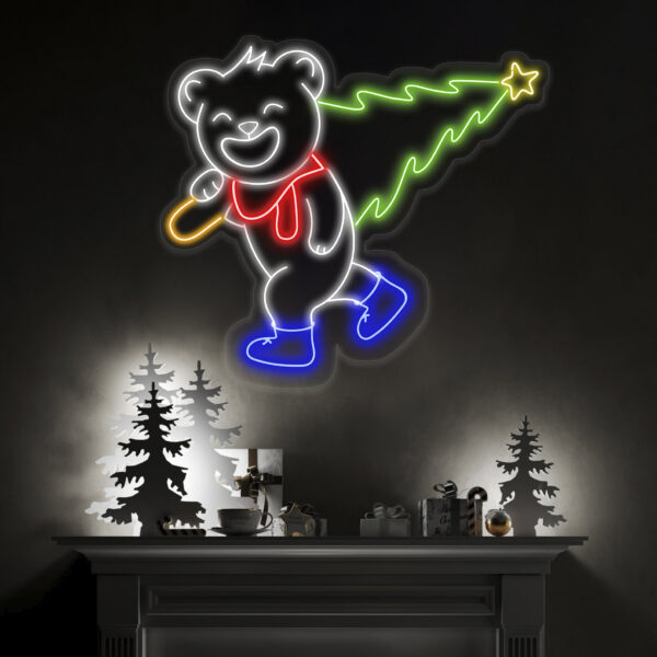 Smiling Bear Carrying A Christmas Tree Neon Sign, Bear Christmas Led Sign, Merry Christmas Neon Light, Christmas Tree Wall Art, Wall Decor