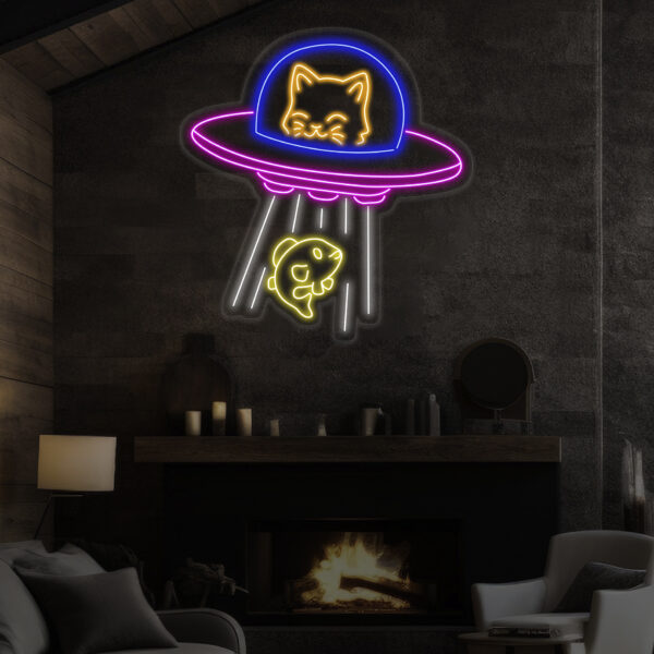 UFO Cat Abduction Fish Neon Sign, Custom Neon Sign UFO Lamp, Ufo Cat LED Light, Animal Lover Neon Light, Gift for Kids, Bedroom Decor